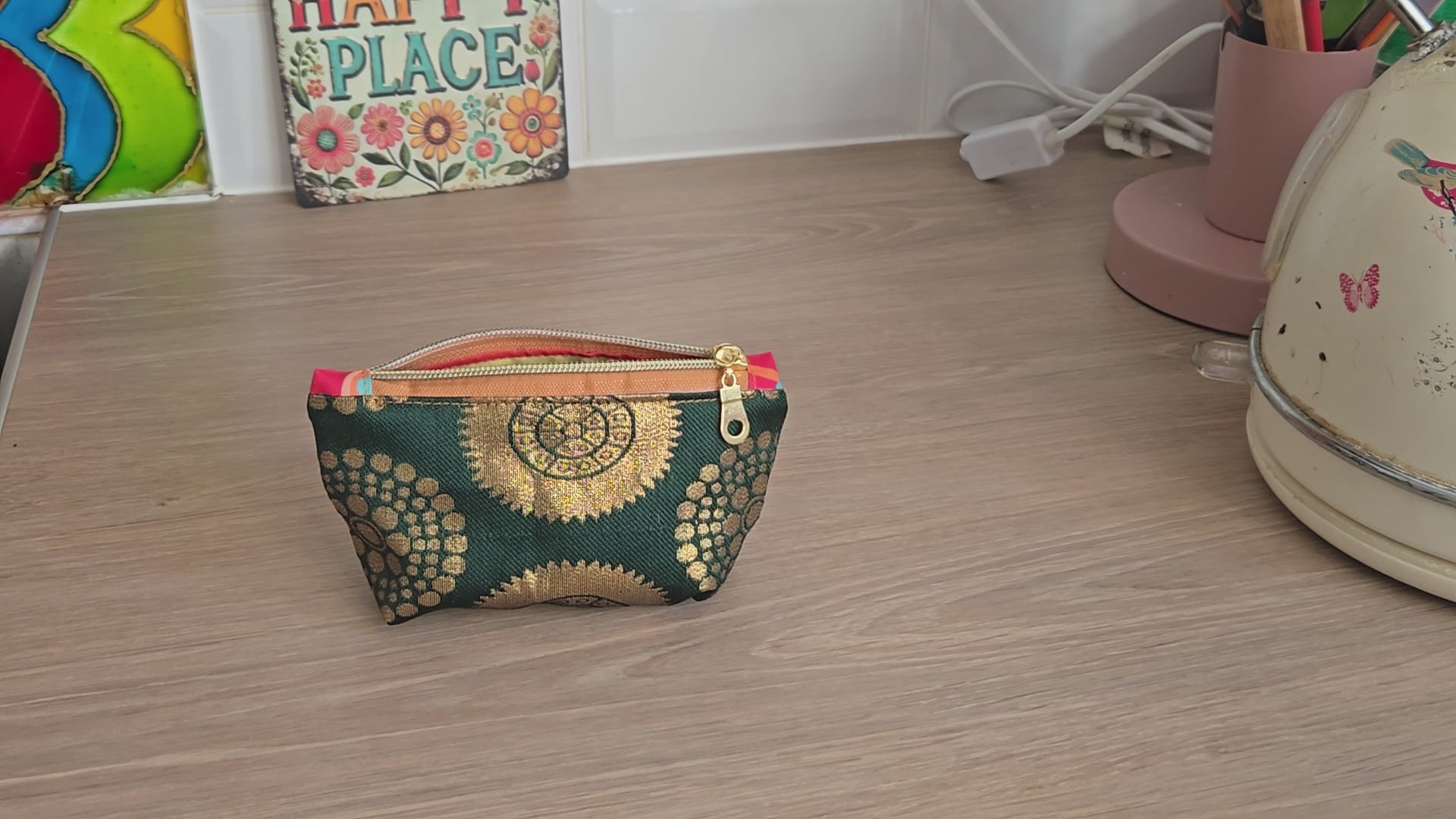 This one is made from a emerald green and gold brocade outerfabric and a orange,yellow and blue wipe clean lining.